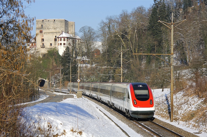 RABDe 500 035-1 "Niklaus Riggenbach" als ICN 1618 Basel SBB - Lausanne zwischen Aesch und Duggingen, im Hintergrund Schloss Angenstein © F. Buchmann